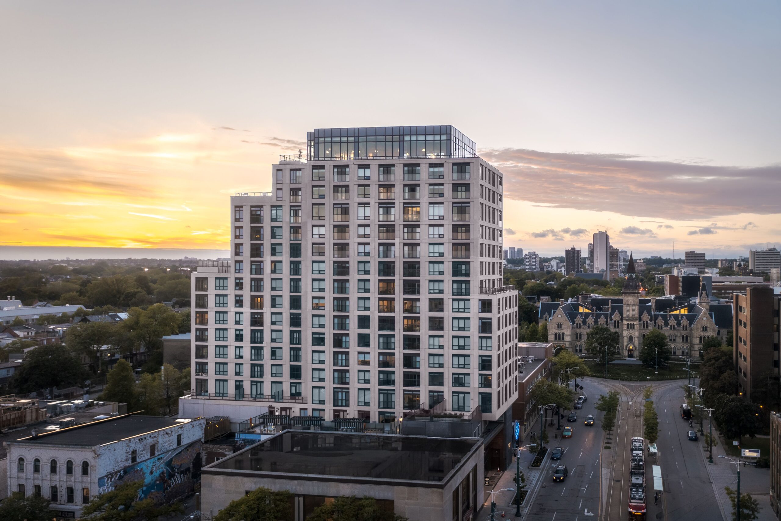 Located on the former Waverly Hotel and Silver Dollar Room site, this 16-storey, 166,000 square foot mixed-use building consists of 166 purpose-built premium rental units, a double-height lobby lounge space featuring a café/bar, and underground parking. Hotel-inspired amenities include an immersive theatre, fitness facility with a yoga/spin studio, and rooftop terrace with an infinity pool. The sophisticated building automation system is integrated with the security system for remote management, minimizing disruption to tenants.